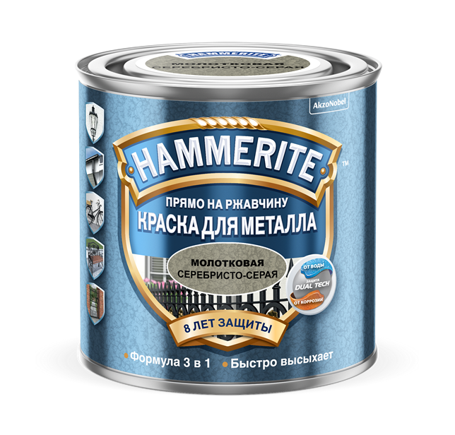 Придаёт интересный декоративный эффект «ручной молотковой чеканки», скрадывает неровности металла и практически незаметна в местах подкрашивания изделия в случае повреждения основного слоя краски.
