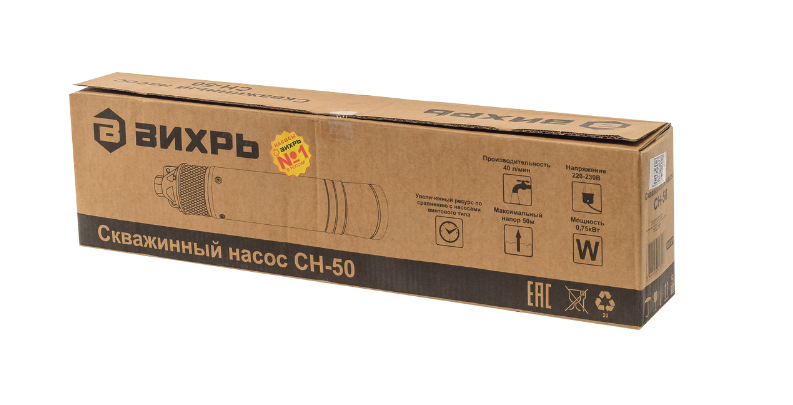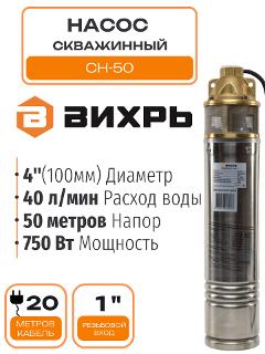 Скважинный насос Вихрь СН-50 (с верхним забором воды) используется для подачи чистой воды из скважин или колодцев глубиной до 50 м в систему орошения сада или водопровод.