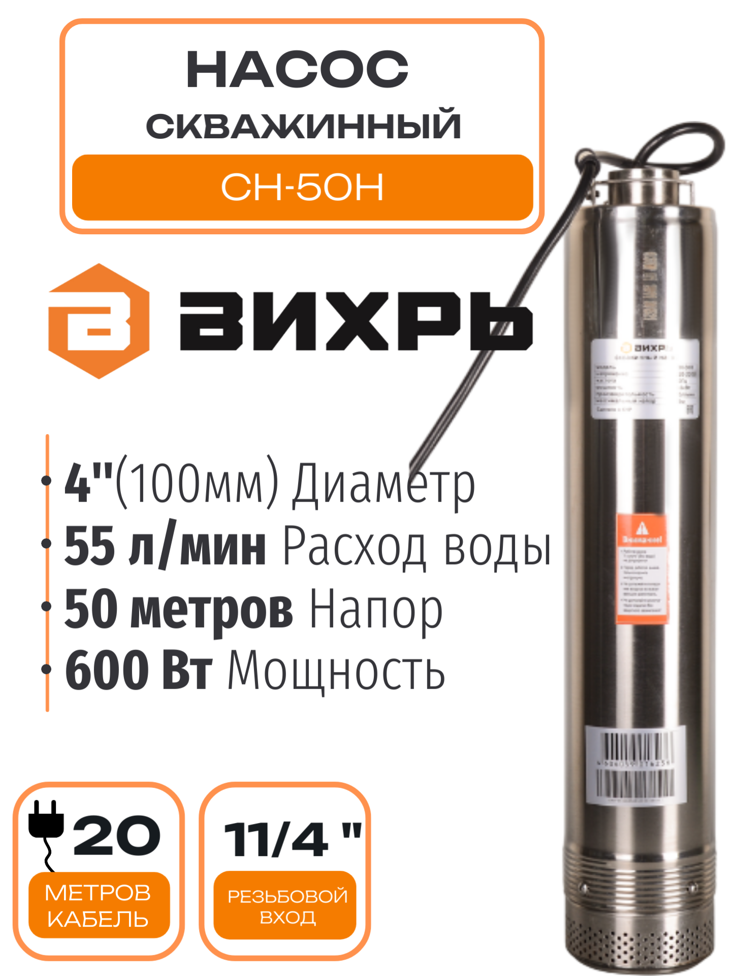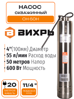 • Скважинный насос Вихрь СН-50Н (с нижним забором воды) предназначен для подачи незагрязненной воды из скважин диаметром не менее 100 мм.