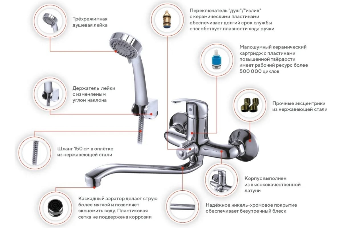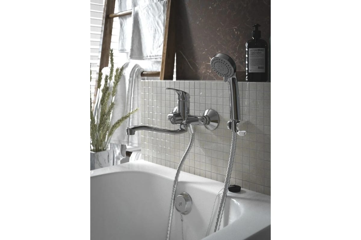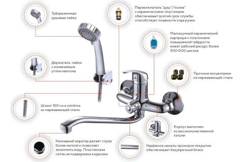 Смеситель для ванны KONNER BASIS с длинным изливом, с аксессуарами BSS1600 оснащён каскадным аэратором с пластиковой сеткой, делающей струю более мягкой и позволяющей экономить воду.