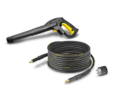 Состоит из шланга высокого давления длиной 12 м и пистолета, к которому крепятся насадки для очистки различных поверхностей.