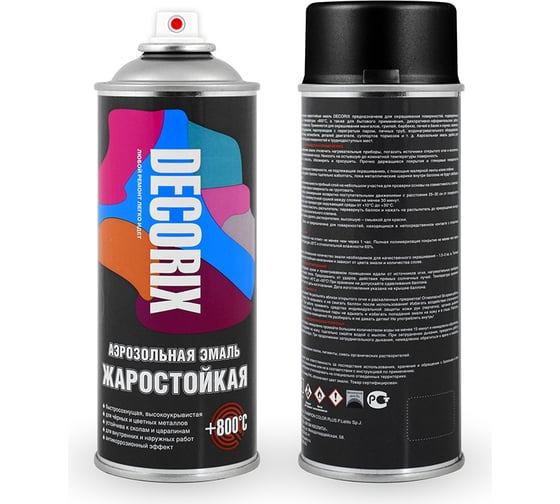 Аэрозольная эмаль Decorix (жаростойкая до +800 градусов; кремнийорганическая; графитово-черный RAL 9011; 520 мл) 0122-9011 DX предназначена для окрашивания поверхностей, подверженных нагреванию до температуры +800°С, а также для бытового применения, декоративно-оформительских работ, строительства и ремонта.