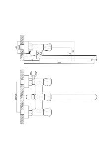 Материал: цинковый сплав, никель-хромовое покрытие, кран-буксы с керамическими пластинами. Угол поворота 180°,каскадный пластиковый аэратор, встроенный дивертер с керамическим картриджем. Однорежимная душевая лейка, крепление лейки к стене с фиксированным углом наклона. Шланг для душа из нержавеющей стали 150 см.