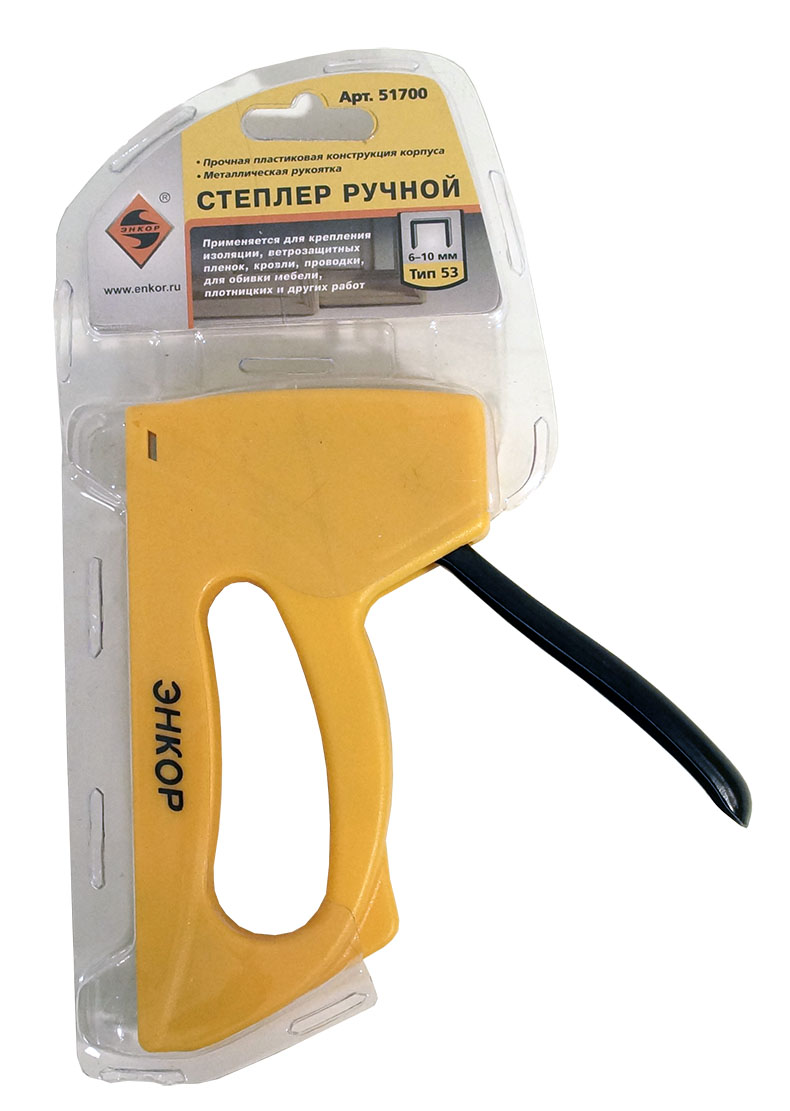 • Ручной степлер 53 6-10мм Энкор 51700 выполнен из пластика, что обеспечивает необходимую легкость при работе.