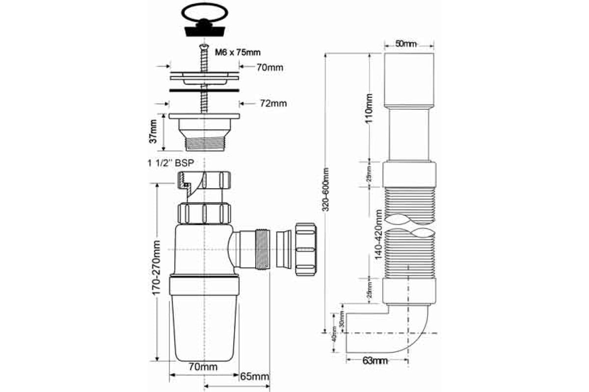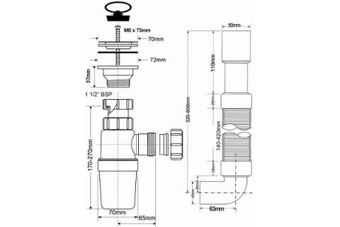 Сифон McAlpine 40-32 с угл. гофрой 40/50, универсальный MRSK9 применяется для отвода стоков и может устанавливаться с раковиной или умывальником. Оснащен выпуском (70 мм нержавеющая решетка), пробкой и отводным раздвижным коленом под 90° длиной от 300-500 мм, выход Дн=40/50 мм.