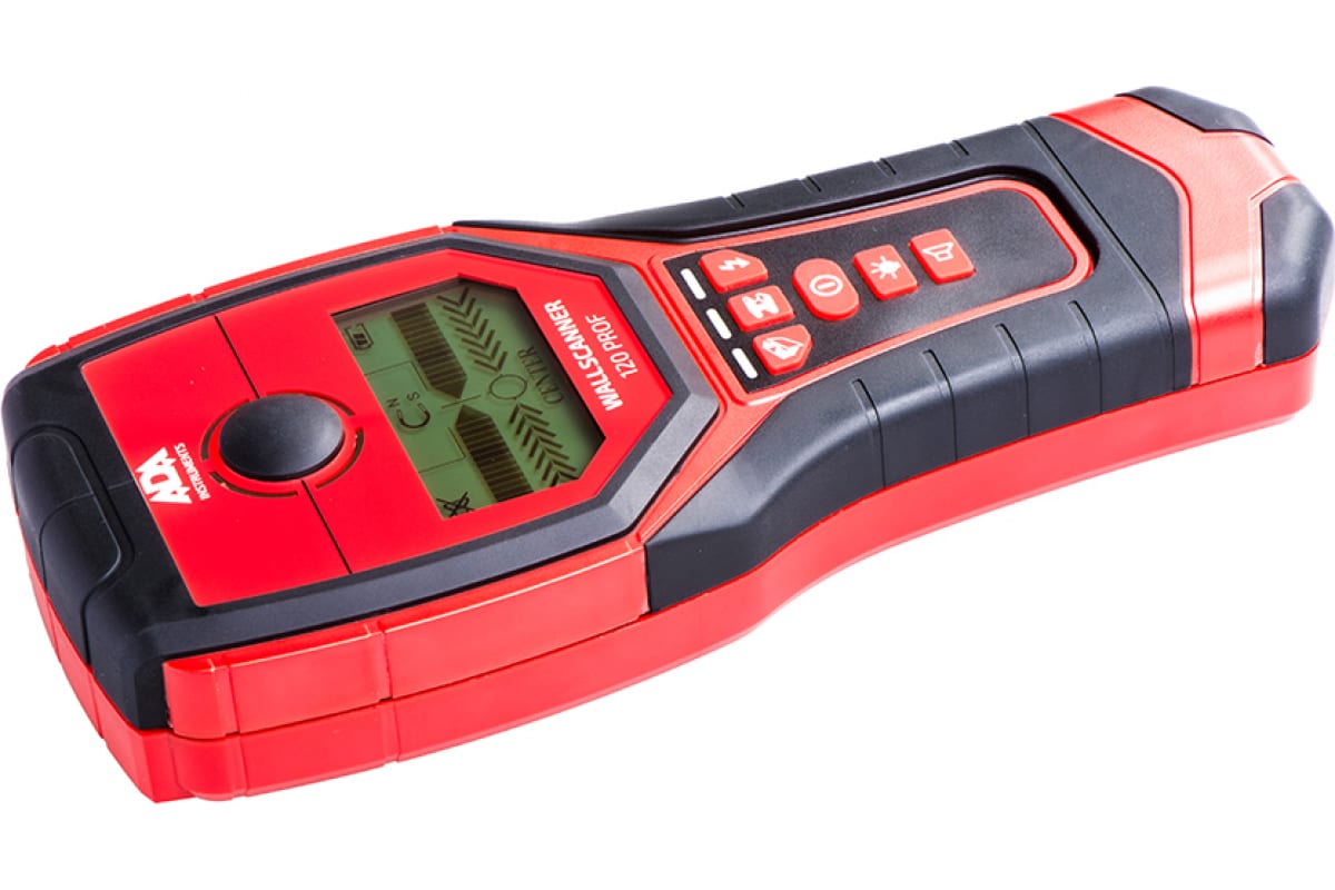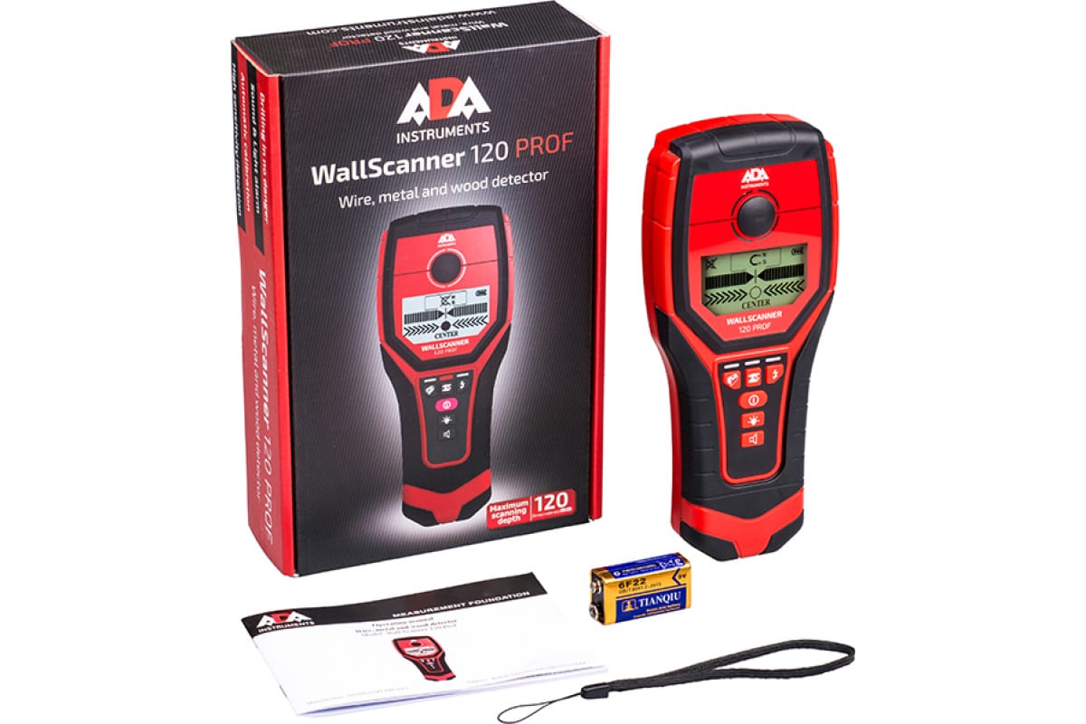 Детектор проводки ADA Wall Scanner 120 PROF А00485 с помощью электрического сигнала помогает обнаружить черные и цветные металлы, проводку под напряжением и деревянные конструкции в стенах, потолках и полах.