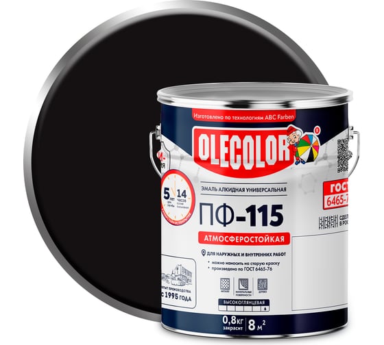 Эмаль OLECOLOR ПФ-115 черный, 5 кг 4300002458 предназначена для обработки деревянных, металлических и других поверхностей, подвергающихся атмосферным воздействиям, а также для окраски внутри помещений.