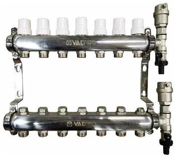 Коллекторный блок из нержавеющей стали служит для распределения потоков по контурам теплого пола, радиаторного отопления, прочих климатических систем, где в качестве теплоносителя используется вода либо незамерзающие растворы гликоля с максимальной рабочей температурой 90 °С, рабочим давлением до 9 бар.