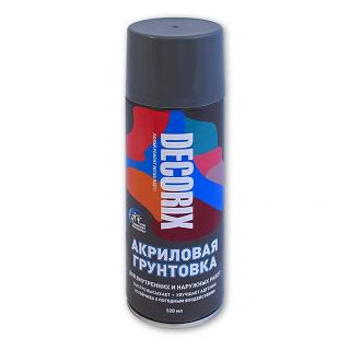 Аэрозольная акриловая грунтовка Decorix (матовая; серая; 520 мл) 0108-10 DX предназначена для подготовки поверхностей перед последующим окрашиванием любыми видами лакокрасочных материалов при бытовом применении, декоративно-оформительских работах, строительстве и ремонте.