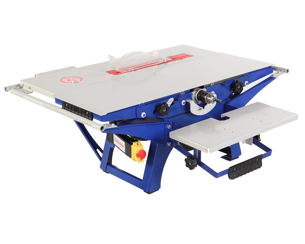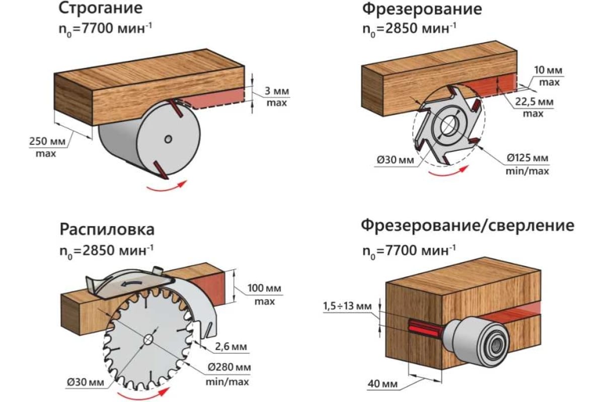• Установка включает в себя следующие функции: сверление, фрезерование, продольная и поперечная распиловка, а также строгание.