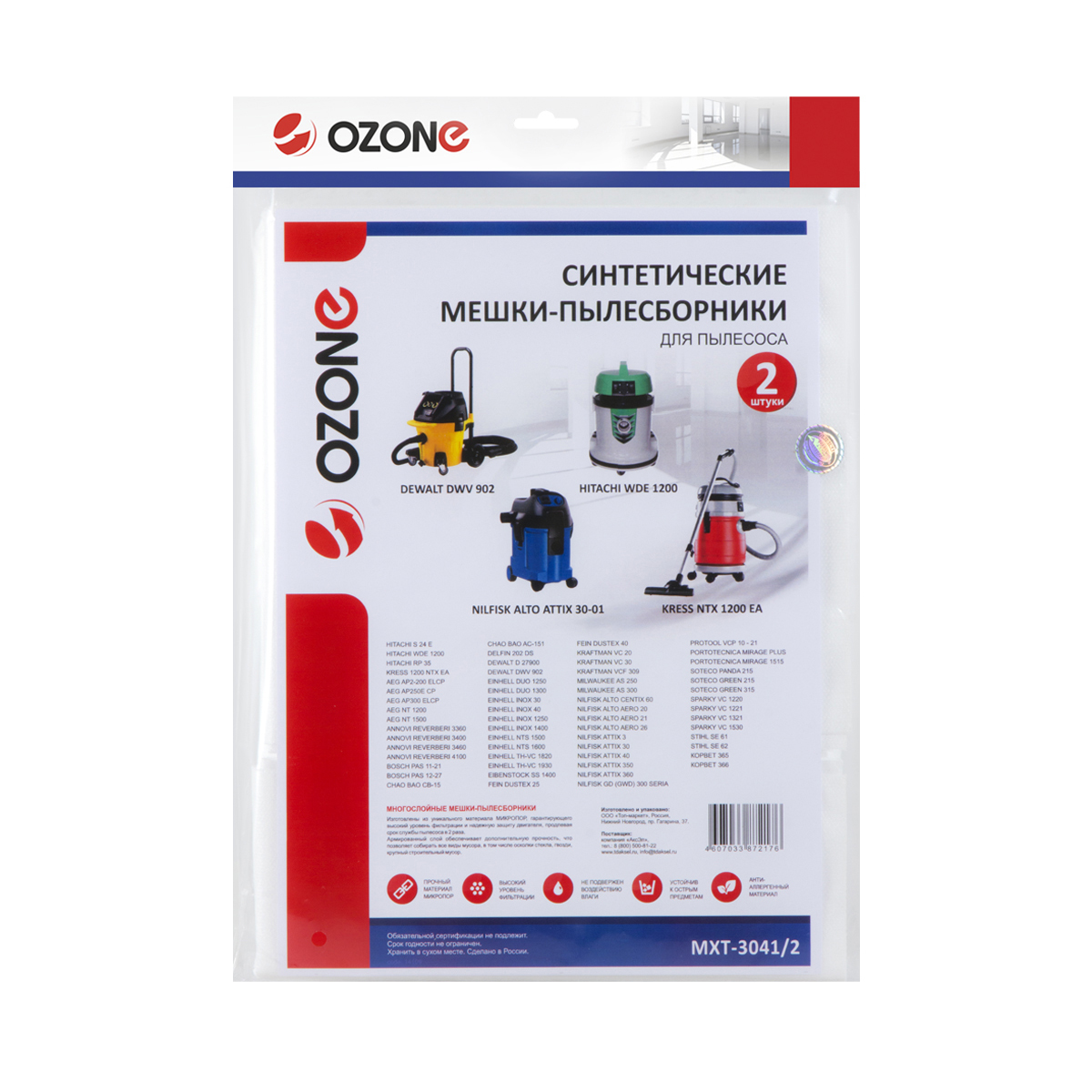 Мешок-пылесборник turbo OZONE OZONE XT-3041 используется в качестве расходного материла в следующих пылесосах: HITACHI RP 35 YB/YE; AEG AP 250;300; NT1200;NT1500; AR 3360; 4100; BOSCH PAS 11-21;12-27; DELFIN MISTRAL202 DS; DEWALT D27900; 902; EINHELL DUO 1250; DUO1300A; INOX 30; 40; 1250;1400; 500;1600; Fein Dustex25; 40; HITACHI S24E;1200; Karcher 3000 Plus; A3100; K2150; Kraftman VC 20; VC 30; VCF 309; KRESS 1200 NTX EA; Makita 446; 2010L; MILWAUKEE AS 250; AS 300; AS 300 ELCP; NILFISK ALTO Centix60; ALTO WAP SQ550; AERO20-01; Attix 30; 350; Attix 360; GD 300 Seria; Portotecnica Mirage Plus; Mirage 1515;SOTECO PANDA 215; SPARKY VC 1220; VC 1530; STIHL SE 61; КОРВЕТ 365; 366. Это одноразовый мешок, который изготовлен из синтетического четырехслойного материала"micro-por". Добавление мельтблауна обеспечивает наличие фильтрующих слоев с более тонкими волокнами. Данный мешок обладает большей механической прочность, по сравнению с бумажными пылесборниками. Он не теряет фильтрующих качеств даже при работе с влажным мусором. При использовании данного пылесборника двигатель пылесоса работает без перегрузок.
