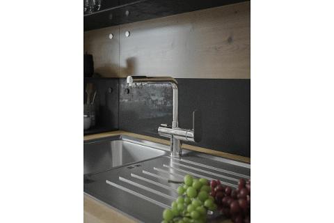 Поворотный излив изготовлен из нержавеющей стали и оснащён каскадным аэратором с пластиковой сеткой, делающей струю более мягкой и позволяющей экономить воду.