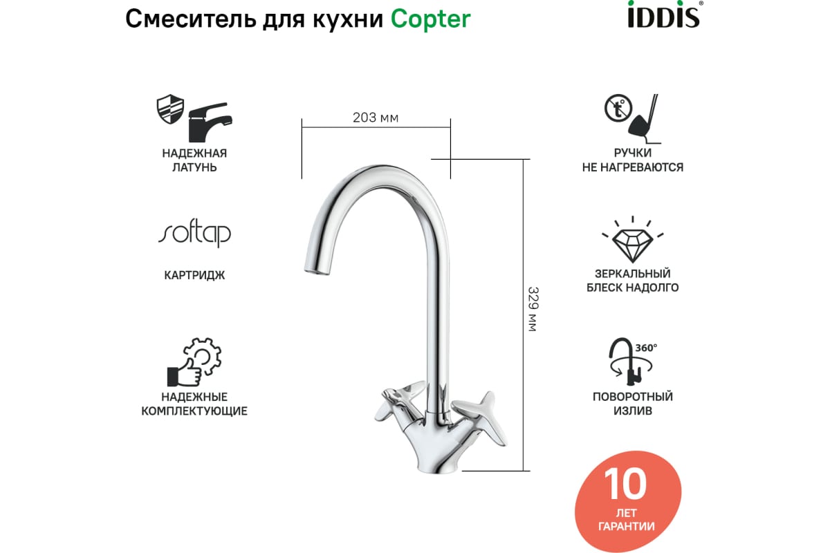 Смеситель для кухни IDDIS Copter ID COPSBJ0i05 - кухонный сантехнический прибор, предназначенный для смешивания горячей и холодной водопроводной воды до комфортной температуры, а также регулирования интенсивности потока. Устройство отличается высоким рабочим ресурсом, выдерживает большие нагрузки, стабилен при перепадах температур и давления в системе водоснабжения.