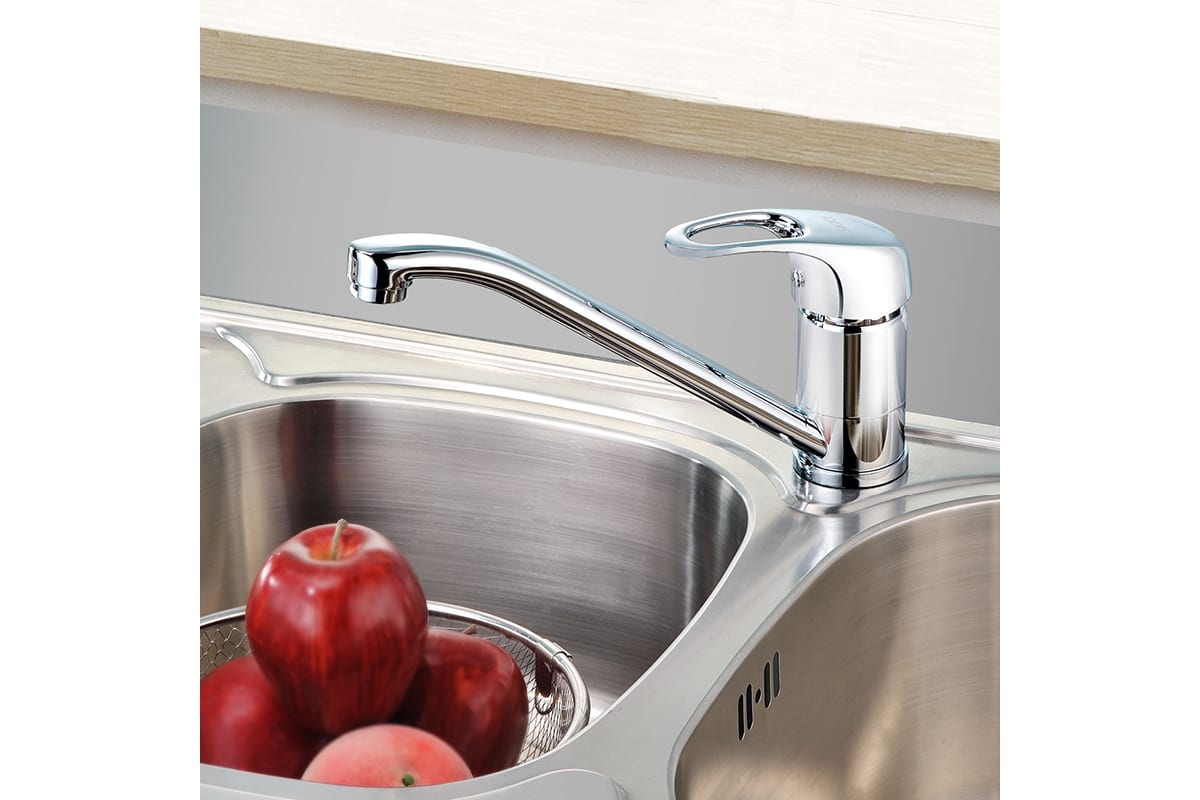 Смеситель для раковины IDDIS Alborg K56001C - классическая модель кухонного сантехнического устройства для смешивания горячей и холодной водопроводной воды. Изделие имеет невысокий поворотный излив, один рычаг управления, аэратор, надежный картридж и гибкую подводку в комплекте.