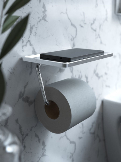 Совмещающий в себе держатель для туалетной бумаги с элегантной миниатюрной полочкой, которая идеально подойдёт для расположения на ней мобильного телефона либо дополнительного рулона туалетной бумаги.