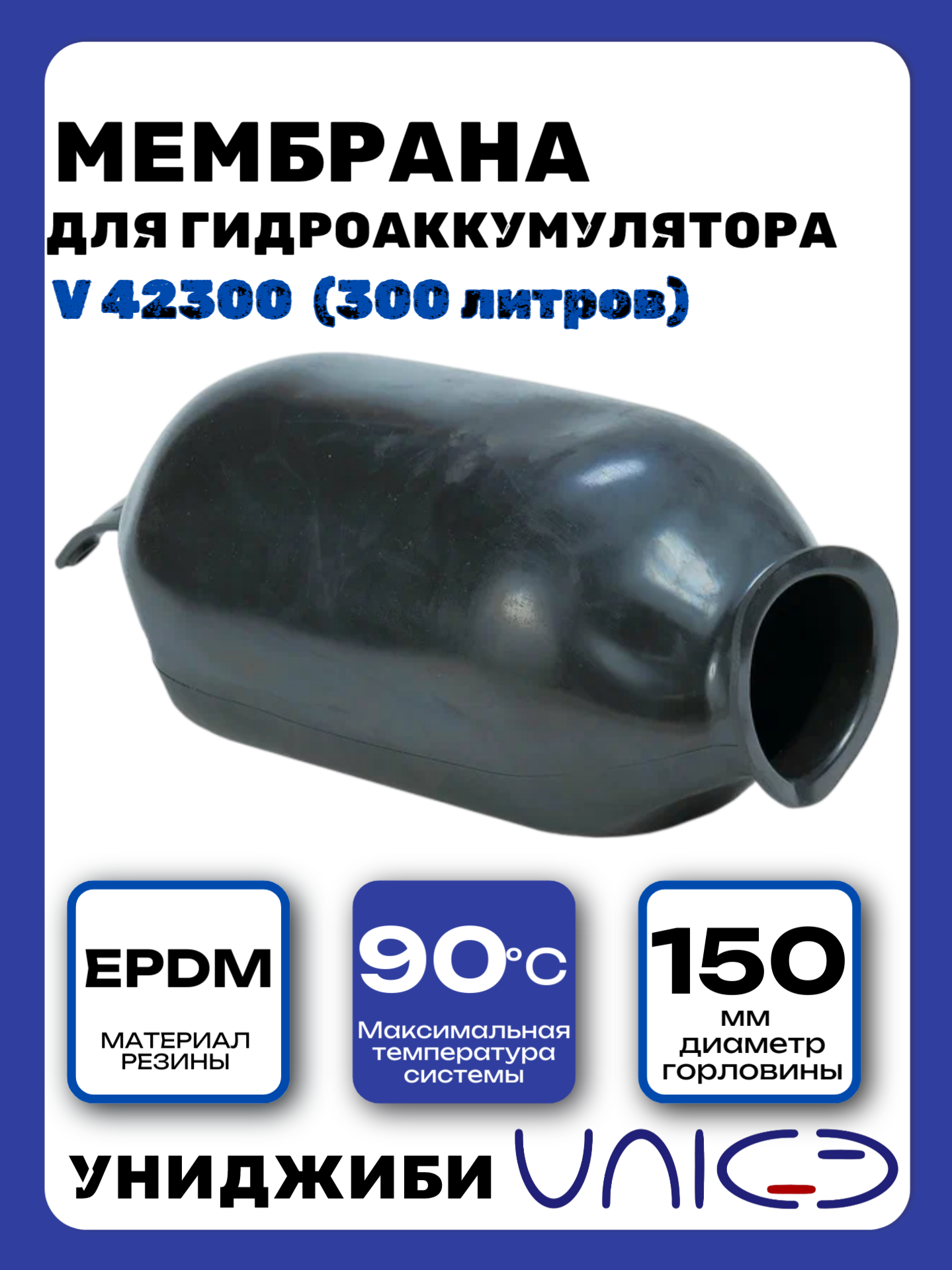 Мембрана VAREM Униджиби для гидроаккумулятора 300 л ( V42300 ) ( 150/195/1200 мм )Мембрана VAREM Униджиби для гидроаккумулятора 300 л ( V42300 ) ( 150/195/1330 мм ) подходит для вертикальных и горизонтальных баков Varem-Униджиби. Мембрана для гидроаккумулятора VAREM Униджиби для гидроаккумулятора 300 л - это важный компонент системы водоснабжения, обеспечивающий равномерное распределение и сохранение давления в системе. Мембрана служит для разделения сред воздуха и воды в баках. Мембрана изготовлена из прочного и надежного материала EPDM (синтетическая этилен/пропиленовая эластичная резина), допущенного для работы с питьевой водой. На этапе производства вводятся специальные добавки, повышающие эластичность мембраны, прочность на разрыв, стойкость к старению материала, тем самым увеличивается срок службы изделия. Таким образом, изделия из данного материала обладают высокой степенью стойкости к химическим и температурным воздействиям. Это позволяет использовать мембрану в разнообразных условиях эксплуатации. Максимальное рабочее давление составляет 10 Атм, что обеспечивает безопасность и эффективность работы системы. Максимальная температура воды, с которой может работать мембрана, достигает 99 °C, что обеспечивает ее надежность и долговечность. Диаметр горловины мембраны составляет 150 мм, что обеспечивает прочное и надежное соединение с гидроаккумулятором. Мембрана подходит для баков размером 300 литров, как вертикального, так и горизонтального исполнения, что позволяет ей эффективно работать в системах различного масштаба. Мембрана для гидробака VAREM Униджиби для гидроаккумулятора 300 л - это надежный и удобный компонент, который обеспечивает равномерное распределение и сохранение давления в системе водоснабжения. Она способствует эффективной работе системы и предотвращает возможные поломки или повреждения. Подходит для установки как в гидроаккумуляторы, так и в экспансоматы. КОНСТРУКТИВНЫЕ ОСОБЕННОСТИ: Макс. рабочее давление – 10 Атм Температура перекачиваемой жидкости, С – от +0 до +99 ТЕХНИЧЕСКИЕ ХАРАКТЕРИСТИКИ: Страна бренда – Италия Производитель – Varem (ООО "Униджиби") Количество отверстий – 2 Тип – универсальная Объем, л – 300 Размеры, мм – 150/195/1330