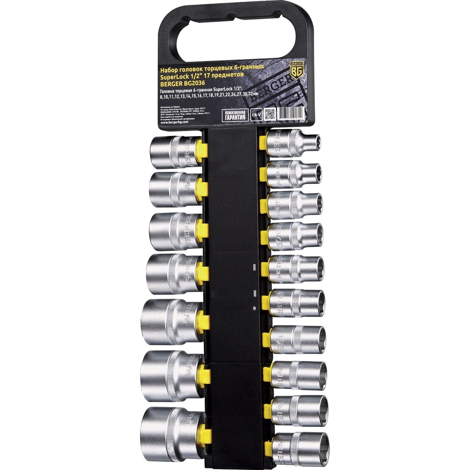 Набор торцевых головок 1/2 SuperLock 17шт Berger BG2036 - комплект монтажно-демонтажных приспособлений для обслуживания конструкций и механизмов/агрегатов, где используется шестигранный тип крепежа.