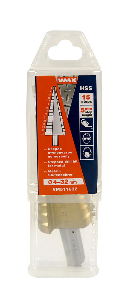 Сверло ступенчатое по металлу (4-32 мм; 15 ступеней; шаг 2 мм, ход 5 мм) VMX (511632)