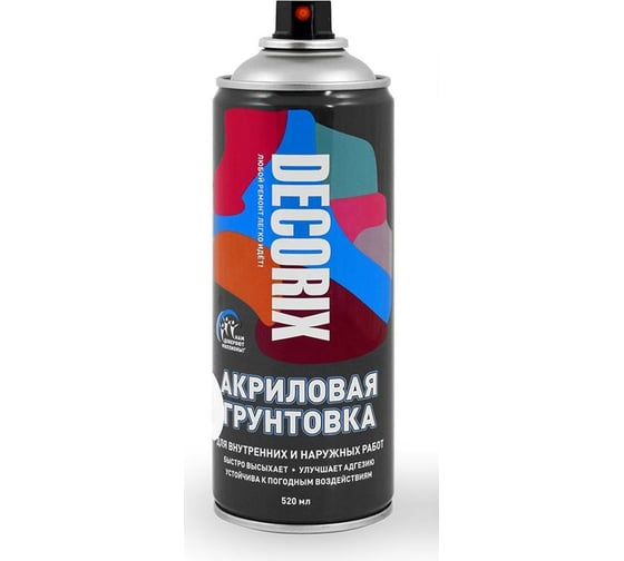 Аэрозольная акриловая грунтовка Decorix (матовая; белая; 520 мл) 0108-24 DX предназначена для подготовки поверхностей перед последующим окрашиванием любыми видами лакокрасочных материалов при бытовом применении, декоративно-оформительских работах, строительстве и ремонте.