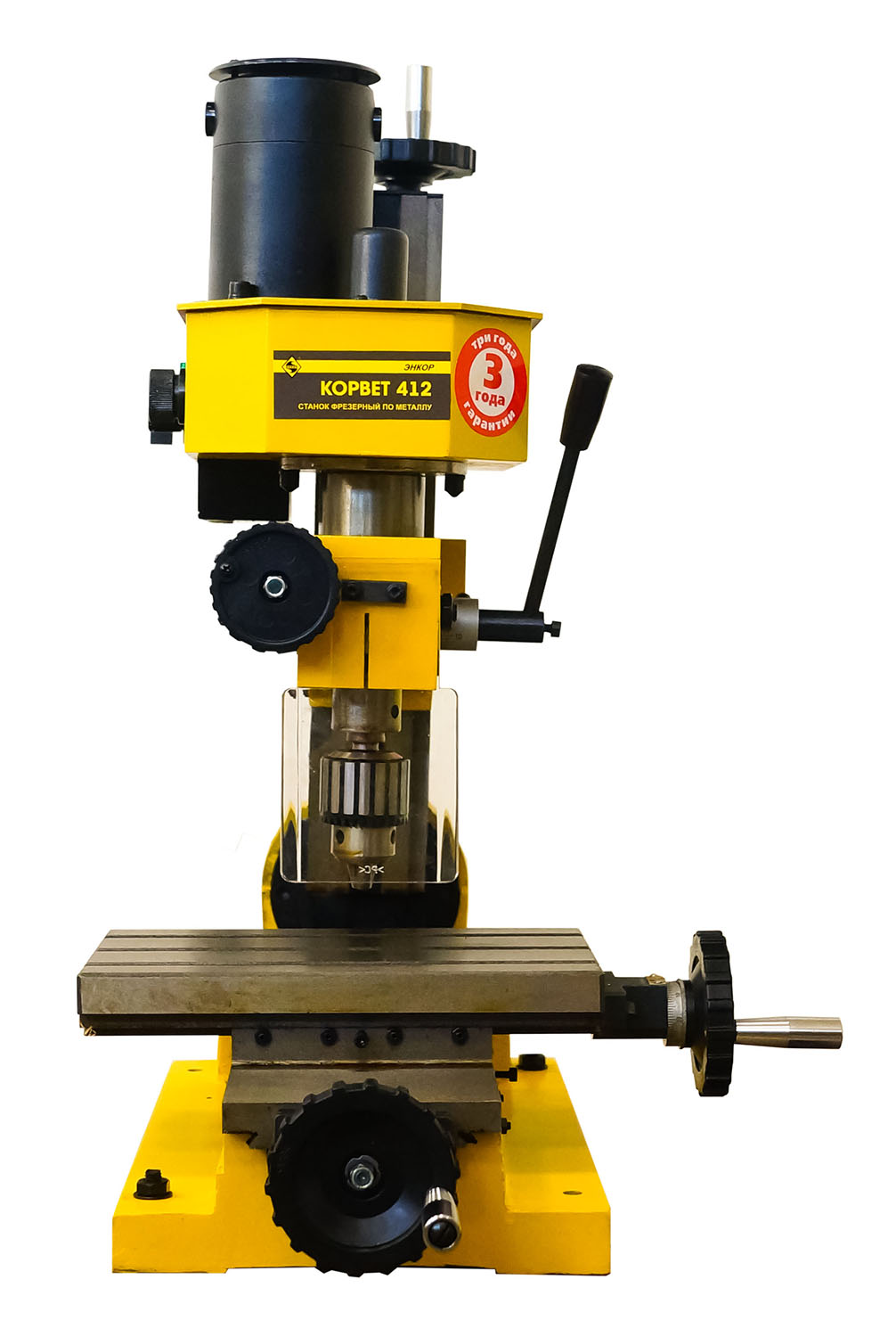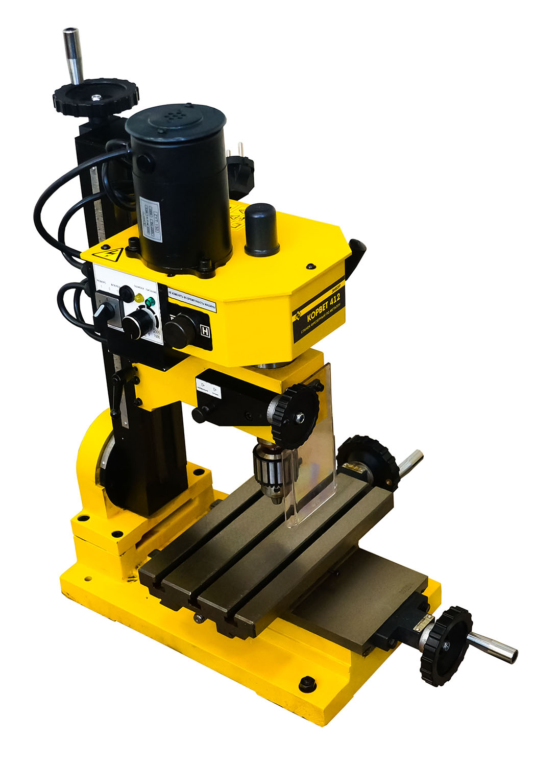 Скорость вращения шпинделя можно выбирать с помощью вариатора, работающего в двух диапазонах. Первая передача позволяет изменять частоту в пределах 100-1000 оборотов в минуту, а вторая - 100-2000. За счет этого можно выбирать оптимальный режим работы, сочетающий в себе скорость и необходимый уровень точности. Преимуществом данной модификации оборудования также является возможность наклона шпинделя на угол до 45 градусов в обе стороны, за счет чего достигается возможность производства сложных объектов. В качестве основного рабочего органа применяется концевая фреза или спиральное сверло диаметром до 10 мм - их крепление обеспечивается с помощью патрона Морзе №2. При использовании торцевого инструмента, которым может оснащаться модель Энкор Корвет-412, этот показатель возрастает до 20 мм. Характеристики агрегата также включают ход шпинделя, равный 30 мм, и расстояние от шпинделя до стола 220 мм, что дает возможность обрабатывать крупные заготовки.