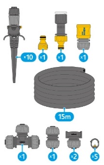 • В комплект входит: 1 -Регулятор давления HoZelock 7022, 15 метров Шланг Flexi Hose HoZelock (7021), 10 шт Капельница Универсальная HoZelock, 5шт Клипса-заглушка HoZelock, 2 шт Заглушка концевая HoZelock, 1шт Коннектор прямой HoZelock, 1 шт Коннектор Т -образный HoZelock