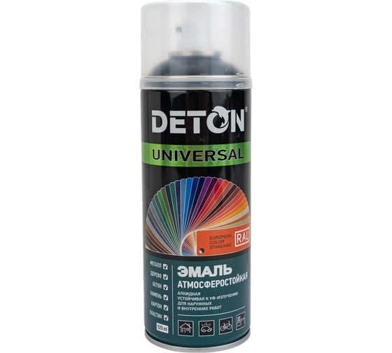 Аэрозольная универсальная эмаль DETON черная, глянцевая RAL 9017 UNIVERSAL 520 мл предназначена для защитно-декоративного окрашивания предварительно загрунтованных поверхностей внутри и снаружи помещений.