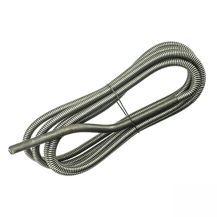 Трос сантехнический диаметром 13,5 мм изготовлен из пружинной проволоки диаметром 1,8 мм и представляет собой полую спираль от 2,5 до 25 метров с ручкой в виде кривого вала на конце.