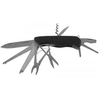 • Его конструкция объединяет 12 инструментов столярно-слесарного назначения - напильник, плоскогубцы, пила, три отвёртки с различным профилем и другие.