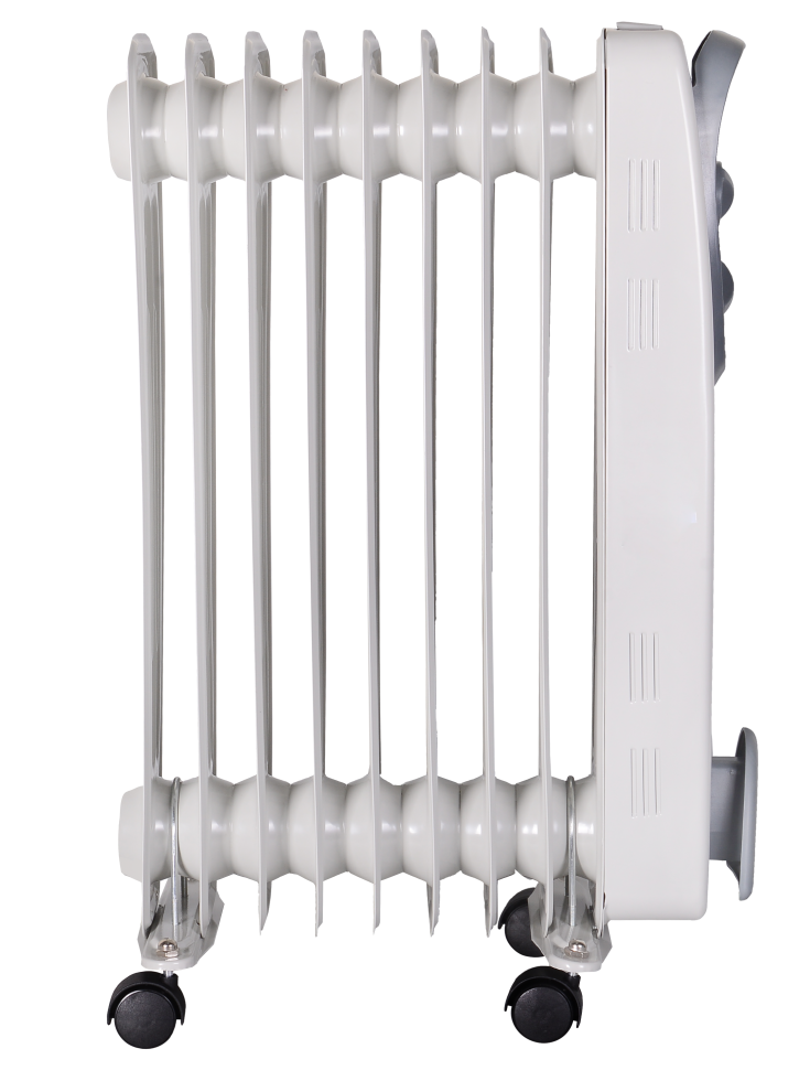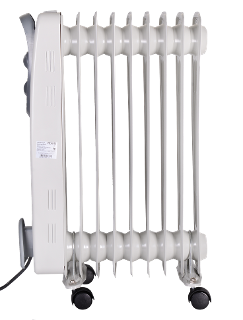 Металлическая конструкция, состоящая из 9 секций, наполнена маслом. Благодаря низкой теплопроводности масла, заданный температурный режим может сохраняться длительное время без необходимости потребления электроэнергии. Прибор автоматически отключается при достижении нужной температуры и самостоятельно включает нагревательный элемент для ее поддержания. При этом температура самого корпуса остается относительно низкой, что исключает выжигание кислорода в комнате. В отличие от тепловентиляторов масляный радиатор работает практически бесшумно, включение и выключение сопровождается легкими щелчками. Управление осуществляется двумя регуляторами. С помощью нижнего выбирается мощность нагрева (800, 1200 или 2000 Вт). С помощью второго можно устанавливать оптимальную температуру. Корпус установлен на устойчивую раму с колесами для удобства передвижения, имеет ручку и кронштейн для наматывания кабеля.